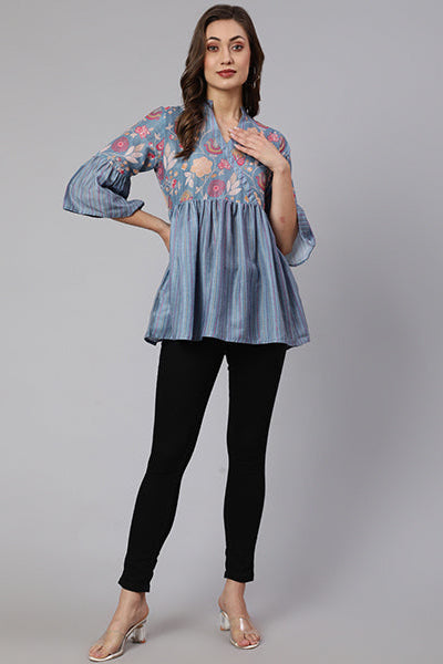 Grey Woven Silk Blend Peplum Top